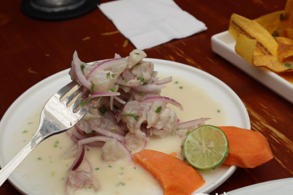 Hay plantas colgantes, luz natural y una música suave que acompaña sin invadir. Todo está pensado para que el ceviche se disfrute con calma, como debe ser.